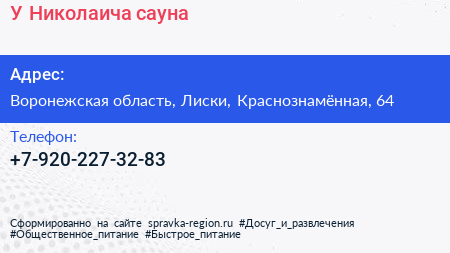 У Николаича, сауна по адресу Воронежская область, Лиски, Краснознамённая, 64 в дальнейшем Организация, размещена в следующих категориях: