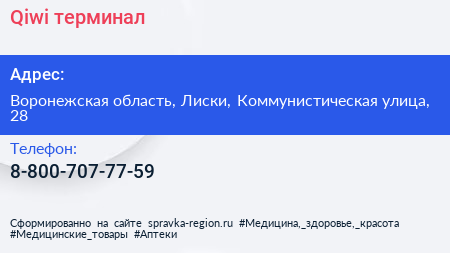 Qiwi, терминал по адресу Воронежская область, Лиски, Коммунистическая улица, 28 в дальнейшем Организация, размещена в следующих категориях: