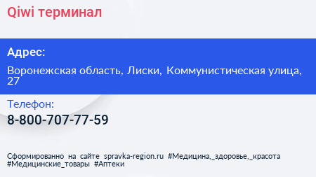 Qiwi, терминал по адресу Воронежская область, Лиски, Коммунистическая улица, 27 в дальнейшем Организация, размещена в следующих категориях: