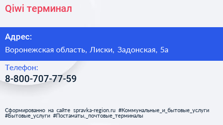 Qiwi, терминал по адресу Воронежская область, Лиски, Задонская, 5а в дальнейшем Организация, размещена в следующих категориях: