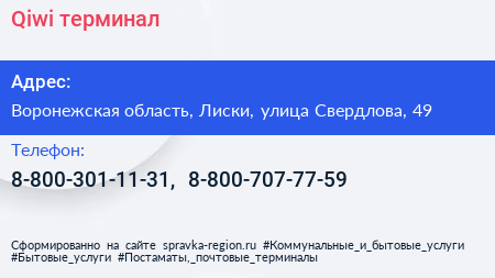 Qiwi, терминал по адресу Воронежская область, Лиски, улица Свердлова, 49 в дальнейшем Организация, размещена в следующих категориях: