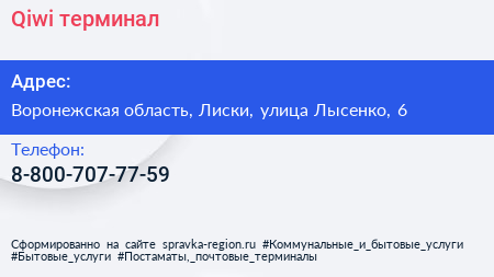 Qiwi, терминал по адресу Воронежская область, Лиски, улица Лысенко, 6 в дальнейшем Организация, размещена в следующих категориях: