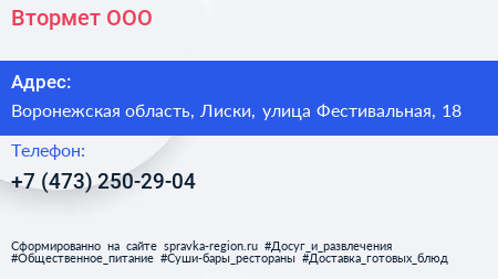 Втормет, ООО по адресу Воронежская область, Лиски, улица Фестивальная, 18 в дальнейшем Организация, размещена в следующих категориях:
