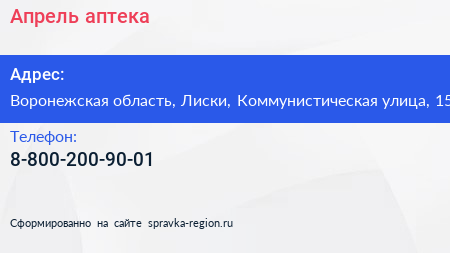 Апрель, аптека по адресу Воронежская область, Лиски, Коммунистическая улица, 15 в дальнейшем Организация, размещена в следующих категориях: