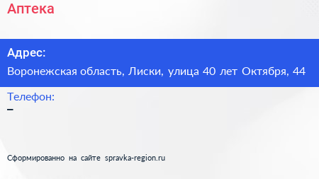 Аптека по адресу Воронежская область, Лиски, улица 40 лет Октября, 44 в дальнейшем Организация, размещена в следующих категориях: