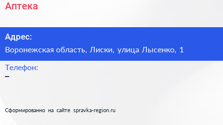 Аптека по адресу Воронежская область, Лиски, улица Лысенко, 1 в дальнейшем Организация, размещена в следующих категориях: