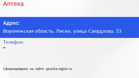 Аптека по адресу Воронежская область, Лиски, улица Свердлова, 53 в дальнейшем Организация, размещена в следующих категориях: