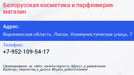 Белорусская косметика и парфюмерия, магазин по адресу Воронежская область, Лиски, Коммунистическая улица, 7 в дальнейшем Организация, размещена в следующих категориях: