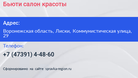 Бьюти, салон красоты по адресу Воронежская область, Лиски, Коммунистическая улица, 29 в дальнейшем Организация, размещена в следующих категориях: