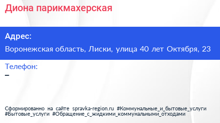 Диона, парикмахерская по адресу Воронежская область, Лиски, улица 40 лет Октября, 23 в дальнейшем Организация, размещена в следующих категориях: