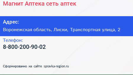 Магнит Аптека, сеть аптек по адресу Воронежская область, Лиски, Транспортная улица, 2 в дальнейшем Организация, размещена в следующих категориях: