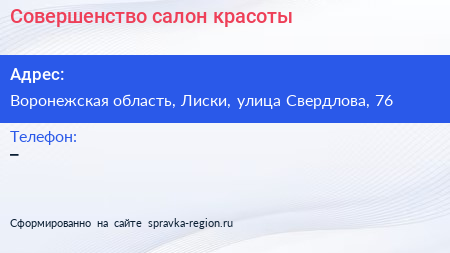 Совершенство, салон красоты по адресу Воронежская область, Лиски, улица Свердлова, 76 в дальнейшем Организация, размещена в следующих категориях: