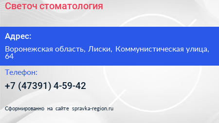 Светоч, стоматология по адресу Воронежская область, Лиски, Коммунистическая улица, 64 в дальнейшем Организация, размещена в следующих категориях: