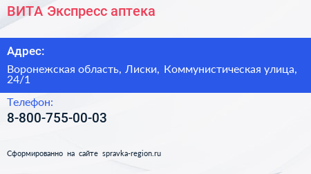 ВИТА Экспресс, аптека по адресу Воронежская область, Лиски, Коммунистическая улица, 24/1 в дальнейшем Организация, размещена в следующих категориях: