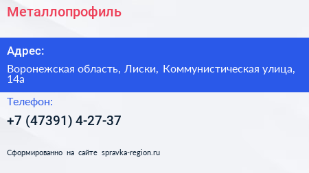 Металлопрофиль по адресу Воронежская область, Лиски, Коммунистическая улица, 14а в дальнейшем Организация, размещена в следующих категориях: