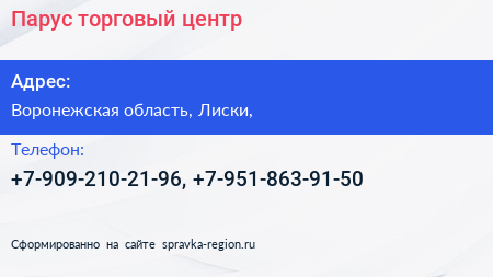 Парус, торговый центр по адресу Воронежская область, Лиски, в дальнейшем Организация, размещена в следующих категориях: