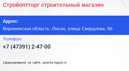 Стройоптторг, строительный магазин по адресу Воронежская область, Лиски, улица Свердлова, 86 в дальнейшем Организация, размещена в следующих категориях: