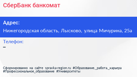 СберБанк, банкомат по адресу Нижегородская область, Лысково, улица Мичурина, 25а в дальнейшем Организация, размещена в следующих категориях: