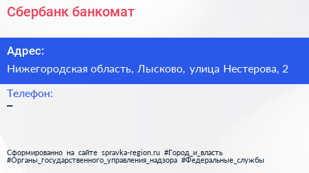Сбербанк, банкомат по адресу Нижегородская область, Лысково, улица Нестерова, 2 в дальнейшем Организация, размещена в следующих категориях: