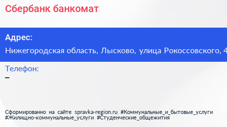 Сбербанк, банкомат по адресу Нижегородская область, Лысково, улица Рокоссовского, 4 в дальнейшем Организация, размещена в следующих категориях: