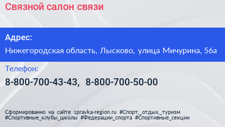 Связной, салон связи по адресу Нижегородская область, Лысково, улица Мичурина, 56а в дальнейшем Организация, размещена в следующих категориях:
