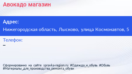Авокадо, магазин по адресу Нижегородская область, Лысково, улица Космонавтов, 5 в дальнейшем Организация, размещена в следующих категориях: