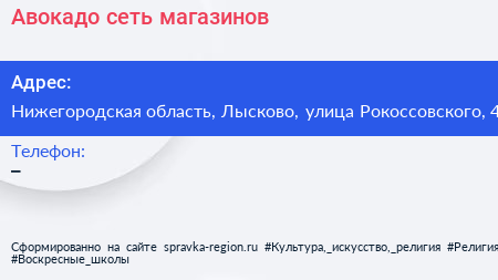 Авокадо, сеть магазинов по адресу Нижегородская область, Лысково, улица Рокоссовского, 4 в дальнейшем Организация, размещена в следующих категориях: