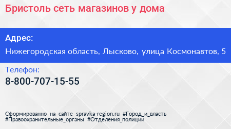 Бристоль, сеть магазинов у дома по адресу Нижегородская область, Лысково, улица Космонавтов, 5 в дальнейшем Организация, размещена в следующих категориях: