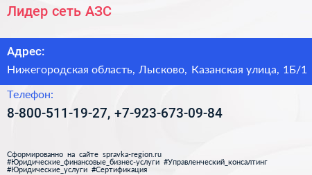 Лидер, сеть АЗС по адресу Нижегородская область, Лысково, Казанская улица, 1Б/1 в дальнейшем Организация, размещена в следующих категориях: