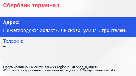 Сбербанк, терминал по адресу Нижегородская область, Лысково, улица Строителей, 1 в дальнейшем Организация, размещена в следующих категориях: