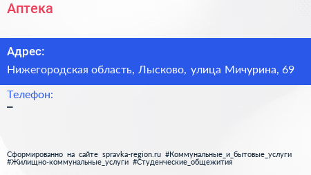 Аптека по адресу Нижегородская область, Лысково, улица Мичурина, 69 в дальнейшем Организация, размещена в следующих категориях:
