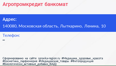 Агропромкредит, банкомат по адресу 140080, Московская область, Лыткарино, Ленина, 10 в дальнейшем Организация, размещена в следующих категориях: