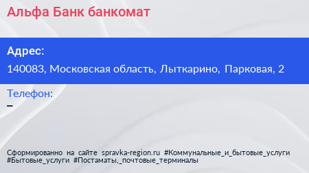 Альфа-Банк, банкомат по адресу 140083, Московская область, Лыткарино, Парковая, 2 в дальнейшем Организация, размещена в следующих категориях:
