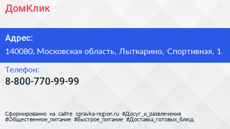 ДомКлик по адресу 140080, Московская область, Лыткарино, Спортивная, 1 в дальнейшем Организация, размещена в следующих категориях: