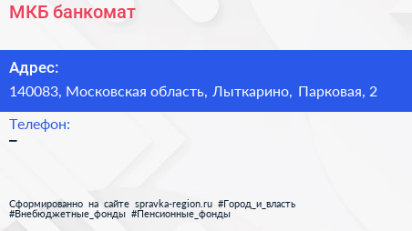 МКБ, банкомат по адресу 140083, Московская область, Лыткарино, Парковая, 2 в дальнейшем Организация, размещена в следующих категориях: