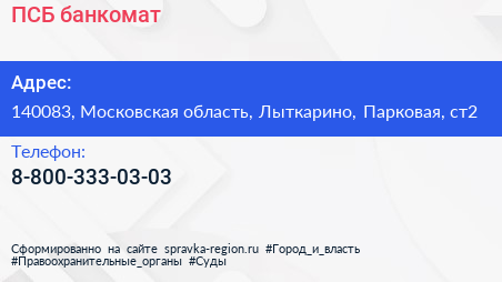 ПСБ, банкомат по адресу 140083, Московская область, Лыткарино, Парковая, ст2 в дальнейшем Организация, размещена в следующих категориях: