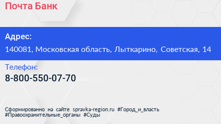 Почта Банк по адресу 140081, Московская область, Лыткарино, Советская, 14 в дальнейшем Организация, размещена в следующих категориях: