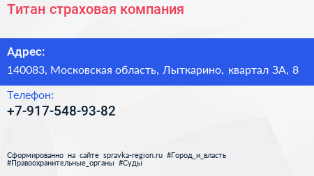 Титан, страховая компания по адресу 140083, Московская область, Лыткарино, квартал ЗА, 8 в дальнейшем Организация, размещена в следующих категориях: