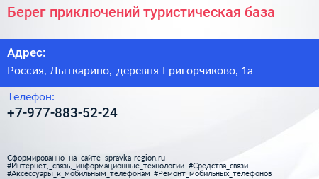 Берег приключений, туристическая база по адресу Туристическая база «Берег Приключений», улица Григорчиково, Григорчиково, Ленинский городской округ, Московская область, Центральный федеральный округ, 142713, Россия в дальнейшем Организация, размещена в следующих категориях: