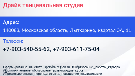 Драйв, танцевальная студия по адресу 140083, Московская область, Лыткарино, квартал ЗА, 11 в дальнейшем Организация, размещена в следующих категориях:
