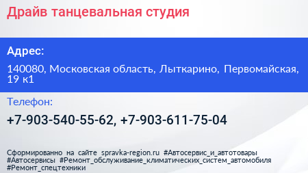Драйв, танцевальная студия по адресу 140080, Московская область, Лыткарино, Первомайская, 19 к1 в дальнейшем Организация, размещена в следующих категориях: