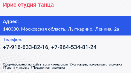 Ирис, студия танца по адресу 140080, Московская область, Лыткарино, Ленина, 2а в дальнейшем Организация, размещена в следующих категориях: