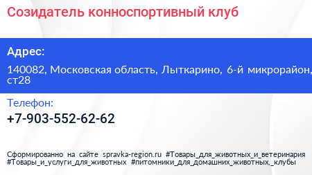 Созидатель, конноспортивный клуб по адресу 140082, Московская область, Лыткарино, 6-й микрорайон, ст28 в дальнейшем Организация, размещена в следующих категориях: