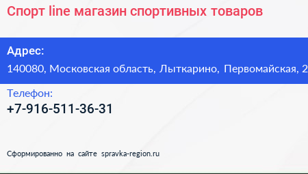 Спорт line, магазин спортивных товаров по адресу 140080, Московская область, Лыткарино, Первомайская, 2 в дальнейшем Организация, размещена в следующих категориях: