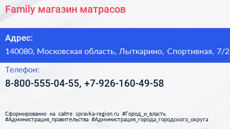 Family, магазин матрасов по адресу 140080, Московская область, Лыткарино, Спортивная, 7/2 в дальнейшем Организация, размещена в следующих категориях: