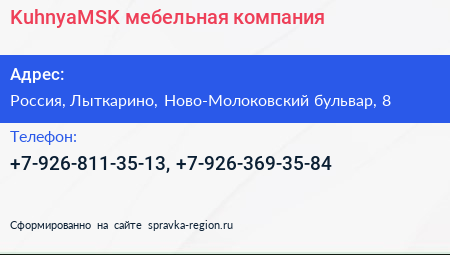 KuhnyaMSK, мебельная компания по адресу 8, Ново-Молоковский бульвар, Жилой комплекс "Ново-Молоково", Молоково, Ленинский городской округ, Московская область, Центральный федеральный округ, 142714, Россия в дальнейшем Организация, размещена в следующих категориях: