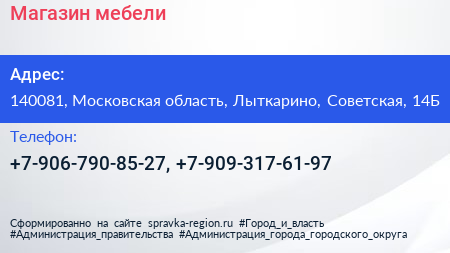 Магазин мебели по адресу 140081, Московская область, Лыткарино, Советская, 14Б в дальнейшем Организация, размещена в следующих категориях: