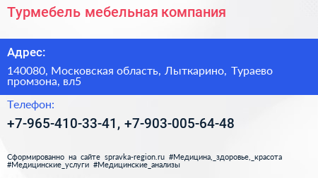 Турмебель, мебельная компания по адресу 140080, Московская область, Лыткарино, Тураево промзона, вл5 в дальнейшем Организация, размещена в следующих категориях:
