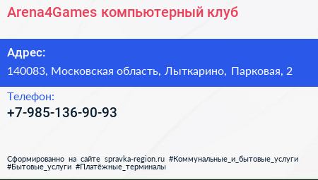 Arena4Games, компьютерный клуб по адресу 140083, Московская область, Лыткарино, Парковая, 2 в дальнейшем Организация, размещена в следующих категориях: