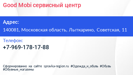 Good Mobi, сервисный центр по адресу 140081, Московская область, Лыткарино, Советская, 11 в дальнейшем Организация, размещена в следующих категориях: